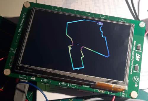 Gdy mapa jest kompletna, zapis nowych danych zostaje wstrzymany, a chmura punktów zostaje złożona w obraz i wyrenderowana na ekranie (fotografia 3). Wyświetlacz jest obsługiwany przez sprzętowy kontroler LTDC, który jest konfigurowany z pomocą biblioteki BSP. Aby nie wyświetlać na ekranie aktualnie edytowanego obrazu, bufor obrazu składa się z dwóch warstw. Edytowana w danym momencie warstwa jest zawsze niewidoczna. Później warstwy są podmieniane, a cykl odbioru i wyświetlania zostaje powtórzony.