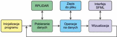 Pierwsza część pętli głównej, czyli pobieranie danych, ma za zadanie przede wszystkim komunikację z LIDAR-em. W tym przypadku skorzystaliśmy z wysokopoziomowego SDK udostępnionego przez producenta LIDAR-u, co znacznie przyspieszyło naszą pracę. Innym źródłem danych mogą być odpowiednio sformatowane pliki tekstowe, które mogą składać się z pojedynczej chmury punktów lub też ich serii (wtedy program odtworzy jedną po drugiej niczym film). Takie rozwiązanie nie wymaga do działania połączenia z LIDAR-em.