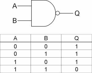 Cofnijmy teraz zegary, wróćmy do czasów panowania standardowej bramki TTL. Jest to umownie przyjęty okres między latami sześćdziesiątymi a dziewięćdziesiątymi XX wieku. Na warsztat bierzemy podstawowy funktor logiczny, jakim jest bramka NAND. Ograniczamy się do bramki 2-wejściowej. Schemat logiczny wraz z tablicą prawdy tego funktora został pokazany na rysunku 1. Zadaniem konstruktorów bramki NAND było zaprojektowanie takiego układu, który podczas normalnej pracy mógłby przyjmować jedynie dwa dozwolone stany wyjściowe: niski i wysoki. Stan niski powinien występować jedynie w przypadku, gdy na oba wejścia są podawane jednocześnie stany wysokie.
