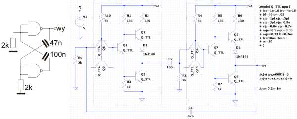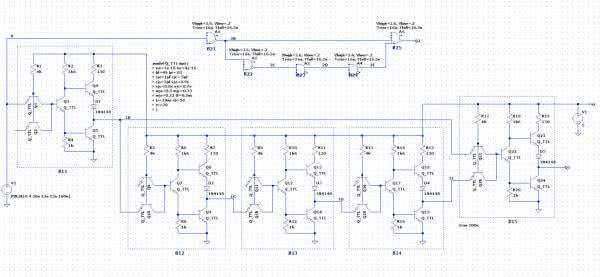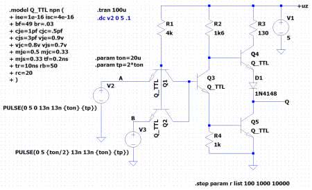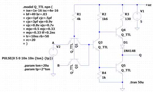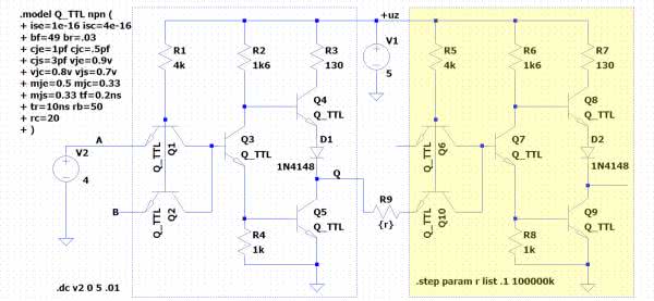 Mimo, że bramkę TTL skonstruowano ponad pół wieku temu, to tranzystory w niej zastosowane odznaczają się znacznie lepszymi parametrami dynamicznymi niż współcześnie dostępne popularne tranzystory dyskretne, np. 2N3904. W pierwszym podejściu do symulacji bramki TTL zastosowałem tranzystory właśnie tego typu. Okazało się, że taka bramka mogłaby pracować do częstotliwości zaledwie ok. 600 kHz. Jako standardowy element w modelu bramki użyłem diody 1N4148, ale prawdopodobnie jej parametry nie wpływają istotnie na działanie bramki.
