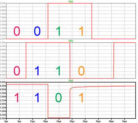 Definicję tego modelu umieszczamy na arkuszu roboczym symulatora. Najpierw zweryfikujemy układ pod względem logicznym. Do wejść doprowadzamy dwa przebiegi prostokątne o parametrycznie zadanym czasie trwania impulsu .param ton=20u i czasie powtarzania .param tp=2*ton. Źródło V3 ma dodatkowo wprowadzone opóźnienie równe ton/2. Dzięki temu można łatwo wygenerować wszystkie kombinacje stanów wejściowych i sprawdzić czy na wyjściu pojawią się stany zgodne z tablicą prawdy. Wyniki symulacji zostały pokazane na rysunku 3. Jak widać, układ działa zgodnie z oczekiwaniami.