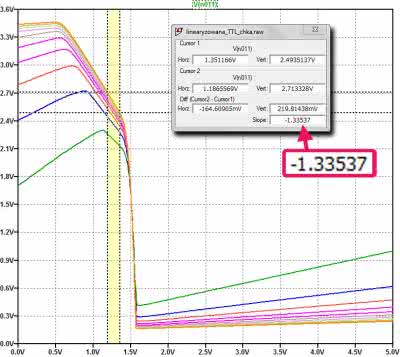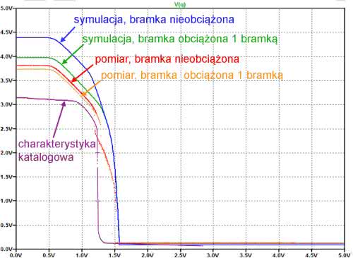 Do wykonania charakterystyki przejściowej korzystamy z symulacji „DC Sweep”. Źródłem wejściowym jest V2. Napięcie zmieniamy w zakresie od 0 do 5 V z krokiem 0,01 V – polecenie .dc v2 0 5 .01. Schemat pomiarowy został pokazany na rysunku 4, zaś wyniki symulacji na rysunku 5. W układzie pomiarowym występują dwie bramki. Wyjście pierwszej jest połączone z wejściem drugiej przez rezystor o parametrycznie określonej rezystancji: .step param r list .1 100000k. W pierwszym kroku wyznaczana jest więc charakterystyka bramki obciążonej jedną bramką (podświetloną na żółto), w drugim kroku można uznać, że pierwsza bramka (badana) pozostaje nieobciążona. Z uzyskanych charakterystyk wynika, że obciążenie jedną bramką spowodowało obniżenie napięcia wyjściowego o ok. 0,4 V. Napięcia wyjściowe w stanie wysokim przy braku obciążenia i z obciążeniem jedną bramką wahają się w układzie symulowanym w przedziale od ok. 4 V do 4,4 V. Pomiary wygrzebanego z szuflady układu UCY7400 wykazały, że napięcia te w analogicznym przypadku zmieniają się od 3,7 V do 3,82 V.