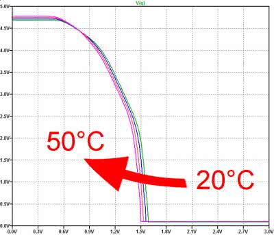 W katalogach można znaleźć charakterystyki, w których napięcie to jest równe ok. 3,2 V i może wystąpić przy maksymalnym obciążeniu bramki. Różnica pomiędzy charakterystykami wynika poza tym z nieidealnych modeli tranzystorów układu scalonego. Należałoby ponadto uwzględnić wpływ temperatury na charakterystyki. W tym celu wprowadzamy opcję: .option temp {temperatura} oraz komendę .step param temperatura list 20 30 40 50. Uzyskujemy w ten sposób rodzinę charakterystyk dla temperatur: 20°C, 30°C, 40°C, i 50°C (rysunek 6).