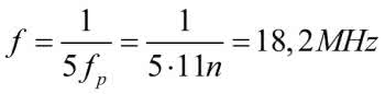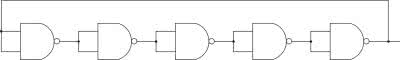Wyobraźmy sobie teraz układ pokazany na rysunku 11. Połączono tu kaskadowo nieparzystą liczbę bramek. Jeśli na wejściu pierwszej występuje stan 1, to na kolejnych wyjściach powinny występować stany: 0-1-0-1-0. Ale jeśli stan wysoki na wejściu podamy w określonym momencie, to stan niski na wyjściu ostatniej bramki pojawi się dopiero po czasie równym sumie czasów propagacji 5 bramek, a więc z pewnym opóźnieniem. Połączenie wyjścia ostatniej bramki z wejściem pierwszej powinno więc spowodować oscylacje o częstotliwości: