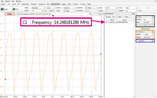 Nie pozostaje nic innego, jak tylko naocznie przekonać się czy tak będzie rzeczywiście. Montujemy układ według schematu z rysunku 11. Emocje rosną. Rzeczywiście, w układzie pojawiły się oscylacje (rysunek 12). Ich częstotliwość jest równa 14,25 MHz, a więc znacznie mniej niż się spodziewaliśmy. Odpowiedź na pytanie skąd wynika taka różnica nie jest prosta. Pierwszą przyczyną może być rozrzut czasów propagacji poszczególnych bramek, tym bardziej że do eksperymentu konieczne jest użycie dwóch układów scalonych. Różnica może również wynikać, z błędów pomiaru czasów tpLH i tpHL.