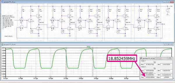 Powielamy 5-krotnie naszą bramkę i łączymy tak uzyskany zestaw zgodnie ze schematem z rysunku 11. Schemat układu symulowanego i wyniki symulacji zostały pokazane na rysunku 13. Wynik: 18,85 MHz, a więc więcej niż w pomiarze.