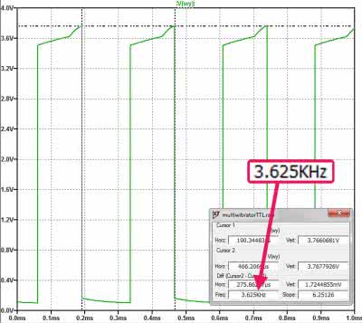 Przy wartościach elementów takich jak na schemacie częstotliwość drgań symulowanego układu jest równa 3,625 kHz. Należy zwrócić uwagę na dwie instrukcje użyte w symulacji: