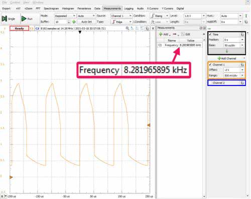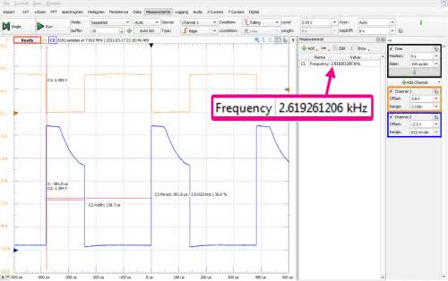 Szybko budujemy analogiczny układ i mierzymy częstotliwość jego drgań. Okazuje się, że jest ona równa 2,62 kHz (rysunek 16). Tym razem taka różnica nie powinna dziwić, gdyż może wynikać z tolerancji użytych elementów. Symulacja metodą Monte Carlo (opisaną w odcinku 13. kursu) przy założeniu 10-procentowych tolerancji rezystancji i pojemności wykazała, że częstotliwość drgań takiego multiwibratora może się zmieniać w szerokim przedziale (1688...4380 Hz).