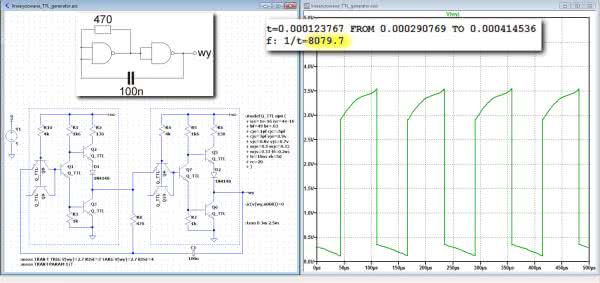 W czasach panowania układów TTL, w aplikacjach o niewygórowanych wymaganiach bardzo często był stosowany prosty układ multiwibratora astabilnego zbudowany na dwóch bramkach NAND, dwóch rezystorach i dwóch kondensatorach.