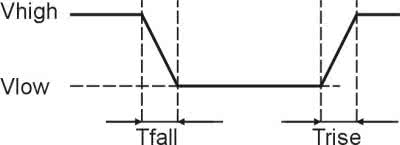 Komentarza wymagają dwa parametry dotyczące czasów, gdyż nie odpowiadają one katalogowym odpowiednikom. Na przykład Trise to czas, po którym napięcie wyjściowe bramki narasta (liniowo) od napięcia Vlow, do napięcia Vhigh (rysunek 20).