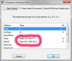 Na ile takie podejście przybliża wynik symulacji do rzeczywistości przekonamy się budując układ generowania opóźnionego impulsu. Tradycyjnie zrealizujemy go na symulowanych modelach bramki TTL, na bibliotecznych funktorach LTspice’a i na układach rzeczywistych. Wymienione wyżej parametry bramek definiuje się po kliknięciu prawym przyciskiem myszki na bramce umieszczonej w obszarze roboczym symulatora (rysunek 21).