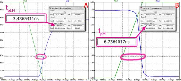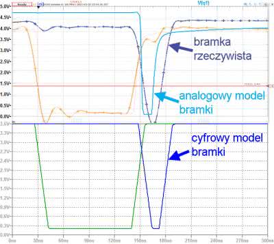 Sprawdzimy teraz jak symulator poradzi sobie z parametrami dynamicznymi. Wyniki symulacji pokażą, jak dobrym modelem tranzystorów dysponujemy, gdyż to on decyduje o zależnościach czasowych występujących w bramce NAND. Podstawowym parametrem dynamicznym układów cyfrowych jest czas propagacji. Jest to czas, po którym na wyjściu układu pojawia się odpowiedź na wymuszenie. W praktyce rozróżnia się czasy propagacji dla zmian ze stanu niskiego na wysoki (tpLH) oraz dla zmian ze stanu wysokiego na niski (tpHL). Konieczne jest jeszcze ustalenie napięcia, dla jakiego dokonywany jest pomiar czasu. Popatrzmy jeszcze raz na graficzną interpretację przyjętych napięć dla poszczególnych stanów logicznych (rysunek 7). Średnie napięcie strefy zabronionej zarówno dla wejścia, jak i dla wyjścia jest równe 1,4 V.