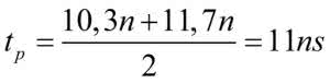 Przyjmujemy: Vlow=0,2 V, High=3,6 V, Trise=16 ns, Tfall=16,3 ns. Opóźnienie impulsu wyjściowego wynika z czasu propagacji sygnału wymuszającego przez 3 bramki (rysunek 22).