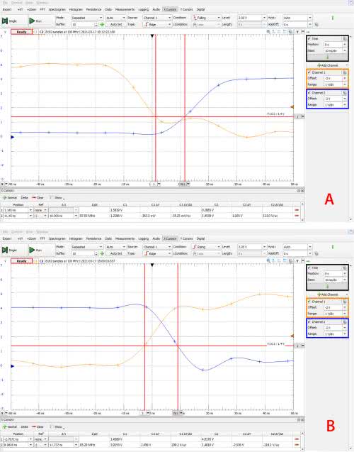 Wynika z nich, że czas tpLH symulowanej bramki jest równy 3,4 ns, a czas tpHL 6,7 ns. Są to czasy dużo krótsze niż katalogowe. Pomiar tych parametrów w układzie rzeczywistym dał wyniki: tpLH=10,3 ns i tpHL=11,7 ns (rysunek 10).