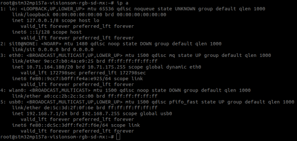 Po uruchomieniu nowej wersji systemu musimy podłączyć urządzenie do sieci. Możemy to zrobić za pośrednictwem interfejsów eth0, lub wlan0, dzięki czemu urządzenie będzie widoczne w sieci lokalnej. Alternatywnie możemy również skorzystać z portu USB-OTG, ponieważ w OpenSTLinux jest on domyślnie skonfigurowany jako Ethernet-over-USB. Dodatkowo widoczny w systemie interfejs usb0 ma skonfigurowany serwer DHCP, dzięki czemu komputer, do którego podłączymy urządzenie otrzyma automatycznie adres IP i będzie mógł się komunikować z modułem VisionSOM tak samo jak w sieci lokalnej. Wszystkie dostępne interfejsy sieciowe oraz przydzielone im adresy IP możemy zobaczyć wywołując polecenie ip a w terminalu szeregowym, co widać na rysunku 4.