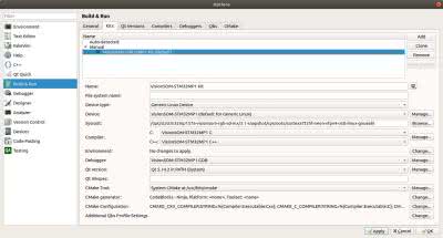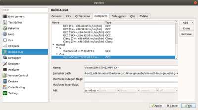 Następnym krokiem jest dodanie ścieżek kompilatorów C/C++ w opcji Build & Run → Compilers. Należy je dodać ręcznie wybierając przycisk Add → GCC → C i Add → GCC → C++. Każdemu z nich powinniśmy nadać nazwę i podać ścieżkę do zainstalowanego SDK: /opt/st/stm32mp157a-visionsom-rgb-sd-mx/3.1-snapshot/sysroots/x86_64-ostl_sdk-linux/usr/bin/arm-ostl-linux-gnueabi/arm-ostl-linux-gnueabi-gcc
