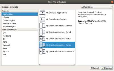 Mając skonfigurowane środowisko możemy rozpocząć tworzenie przykładowej aplikacji na bazie gotowego przykładu z biblioteki. Z menu File wybieramy New File or Project, a w wyświetlonym oknie dialogowym opcję Qt Quick Application – Swipe (rysunek 7). Następnie nadajemy projektowi nazwę – w naszym przykładzie jest to SwipeDemo, oraz lokalizację na dysku. Kolejne opcje możemy zostawić bez zmiany, zwracając uwagę na to, żeby do projektu został przydzielony Kit, który konfigurowaliśmy w poprzednim punkcie. Po zakończeniu działania kreatora zostaje utworzony nowy projekt zawierający okno główne z dwiema stronami które możemy przesuwać za pomocą myszy, lub panelu dotykowego. W projekcie znajdziemy kilka plików, które będziemy mogli zmodyfikować: