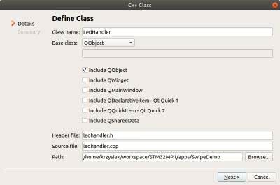 Po zakończeniu kreatora do projektu zostaną dodane dwa pliki nowej klasy: nagłówkowy i źródłowy. Uzupełniamy je zgodnie z kodem podanym na listingu 5 i listingu 6. Obsługa diod będzie wykonywana za pośrednictwem plików znajdujących się w katalogu systemowym /sys/class/leds, dlatego do pliku nagłówkowego dodajemy dwa pola typu QFile* reprezentujące dwie diody obsługiwane przez przycisk (gpioLedFile) i suwak (pwmLedFile). Dodajemy także dwie metody wywoływane w efekcie zmiany stanu komponentów graficznych. Wykorzystują one mechanizm Signals & Slots biblioteki Qt, dzięki czemu możemy powiązać metody deklarowane jako slots, z sygnałami wysyłanymi przez inne obiekty. Więcej na ten temat można przeczytać w oficjalnej dokumentacji Qt.