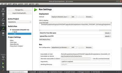 Nasza aplikacja jest już gotowa do uruchomienia na platformie docelowej. Do poprawnego działania musimy jednak podać odpowiedni parametr --platform, dzięki któremu zostaną załadowane dostępne na urządzeniu moduły. Klikamy więc na przycisk Projects po lewej stronie okna głównego IDE i w oknie Run Settings wpisujemy do pola Arguments:
