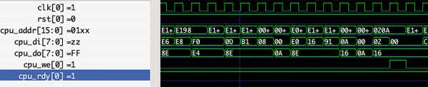 Interfejs zewnętrzny został dostosowany do specyfiki implementacji FPGA i ma dwie oddzielne magistrale: danych wejściowych (DI), oraz wyjściowych (DO). Mikroprocesor może współpracować jedynie z pamięciami synchronicznymi, gdzie dane na magistrali DI są oczekiwane w kolejnym cyklu po wystawieniu sygnału na magistrali adresowej ADDR. Pozostałe sygnały takie jak RDY, NMI, IRQ są zgodne z oryginalnym mikroprocesorem 65C02. Przykładowe sygnały na magistrali podczas wykonania programu z pamięci synchronicznej zostały pokazane na rysunku 2.