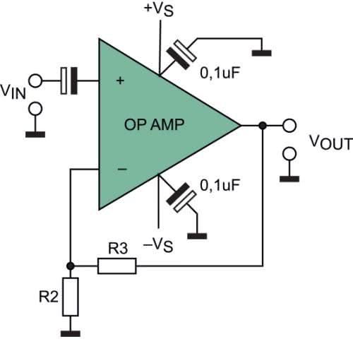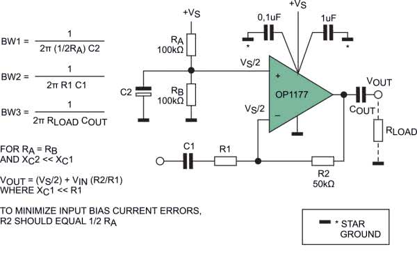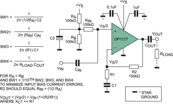 Na rysunku 12 (nieodwracający) i rysunku 13 (odwracający) pokazane są obwody, które realizują polaryzację filtrowanym napięciem VS/2 dla uzyskania możliwie najlepszych parametrów układu. W obu przypadkach na wejściu nieodwracającym podawane jest napięcie polaryzacji, a sprzężenie zwrotne powoduje, że wejście odwracające przyjmuje takie samo napięcie, a wzmocnienie równe jedności również polaryzuje wyjście do tego samego poziomu napięcie. Kondensator sprzęgający C1 obniża wzmocnienie dla sygnałów niskiej częstotliwości do jedności na poziomie częstotliwości BW3. Dobrą praktyczną zasadą przy stosowaniu dzielnika napięcia 100 kΩ/100 kΩ, jak pokazano, jest użycie wartości pojemności C2 wynoszącej co najmniej 10 µF, co zaowocuje przesunięciem się krawędzi –3 dB pasma do 0,3 Hz. Wartość 100 µF (biegun przy 0,03 Hz) jest jeszcze lepsza i należy ją stosować, jeśli jest to możliwe.