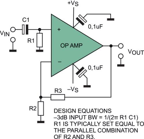 Jednym z najczęściej napotykanych problemów związanych z aplikacjami op-ampów jest brak ścieżki powrotnej DC dla prądu polaryzacji wejścia w obwodach wzmacniacza operacyjnego lub pomiarowego ze sprzężeniem wejścia AC. Na schemacie z rysunku 1 kondensator wejściowy jest połączony szeregowo z nieodwracającym „+” wejściem wzmacniacza operacyjnego. Jest to łatwy sposób blokowania napięć stałych związanych z napięciem wejściowym (VIN) i powinien być szczególnie przydatny w zastosowaniach o dużym wzmocnieniu, gdzie nawet małe napięcie stałe na wejściu wzmacniacza może ograniczyć użyteczny zakres dynamiki, a nawet spowodować nasycenie wyjścia. Jednakże pojemnościowe sprzężenie z wejściem o wysokiej impedancji bez zapewnienia ścieżki dla prądu stałego płynącego na wejściu „+” doprowadzić może do problemów z działaniem układu.