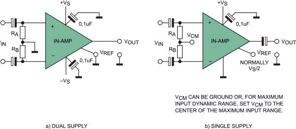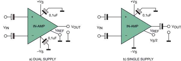 Podobny problem może mieć wpływ na działanie obwodu ze wzmacniaczem pomiarowym. Schemat z rysunku 3 pokazuje aplikację tego rodzaju wzmacniacza z wejściami sprzężonymi pojemnościowo. W układach tych nie zapewniono ścieżki powrotnej dla prądu polaryzacji wejść wzmacniacza. Ten problem występuje w przypadku obwodów wzmacniacza pomiarowego wykorzystujących zarówno podwójne (rysunek 3a), jak i pojedyncze (rysunek 3b) zasilanie.