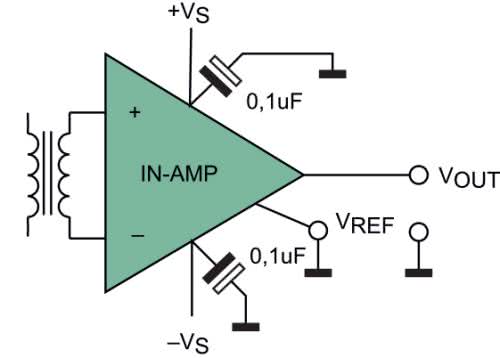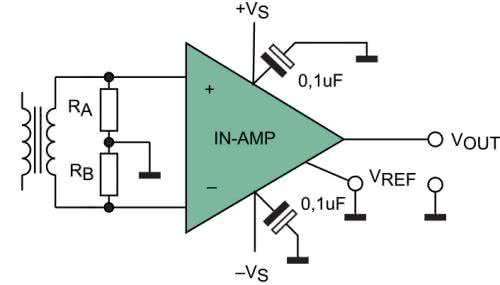 Problem taki wystąpić może również w układach pomiarowych sprzężonych ze źródłem sygnału za pomocą transformatora tak, jak pokazano na rysunku 4, jeśli obwód uzwojenia wtórnego nie ma stałoprądowej ścieżki do masy. Najprostsze rozwiązanie dla wspomnianych układów zaprezentowano na rysunku 5 oraz rysunku 6. Wystarczy, podobnie jak dla wzmacniacza operacyjnego, dodać ścieżkę DC od wejść do masy lub innego napięcia. Dlatego też w układach tych dodane są oporniki (RA, RB) pomiędzy wejściami a masą (dla układów zasilanych symetrycznie) lub napięciem VCM (dla układów zasilanych asymetrycznie). Może to być dowolne napięcie pomiędzy masą a zasilaniem, ale dla uzyskania maksymalnej dynamiki napięcie to powinno być równe połowie napięcia zasilania. Takie samo podejście można zastosować do wejść sprzężonych poprzez transformator (rysunek 6), chyba że uzwojenie transformatora ma wyprowadzenie na środku, które można podłączyć do masy lub VCM.