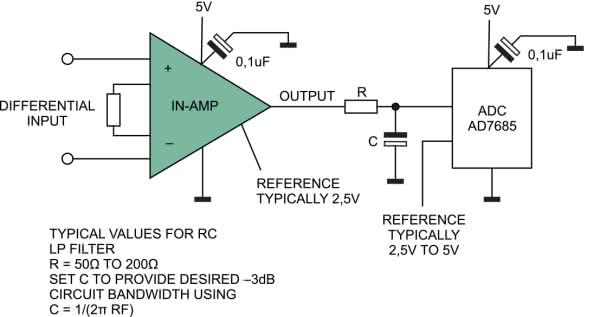 Na rysunku 7 został pokazany obwód z pojedynczym napięciem zasilania, w którym wzmacniacz wejściowy steruje asymetrycznym przetwornikiem analogowo-cyfrowym (ADC). Napięcie odniesienie wzmacniacza zapewnia napięcie polaryzacji odpowiadające zerowemu wejściu różnicowemu, a napięcie odniesienia ADC zapewnia współczynnik skalowania. Prosty dolnoprzepustowy filtr antyaliasingowy RC jest często używany między wyjściem wzmacniacza a wejściem ADC, którym steruje, aby zredukować szum pozapasmowy. Projektanci często ulegają pokusie stosowania prostych rozwiązań, takich jak dzielniki rezystancyjne do uzyskania napięć referencyjnych we wzmacniaczu i przetworniku ADC. Może to prowadzić do błędów w przypadku niektórych wzmacniaczy pomiarowych.