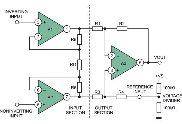 Powszechnym założeniem jest, że wejście napięcia odniesienia we wzmacniaczu pomiarowym ma wysoką impedancję, ponieważ jest traktowane jak każde inne wejście. Dlatego projektant może ulec pokusie, aby podłączyć do niego źródło napięcia o wysokiej impedancji, takie jak na przykład dzielnik rezystancyjny. Może to jednakże spowodować poważne błędy w przypadku niektórych typów wzmacniaczy pomiarowych (rysunek 8). Weźmy za przykład popularną konfigurację wzmacniacza pomiarowego, która wykorzystuje trzy wzmacniacze operacyjne połączone jak na rysunku 8.