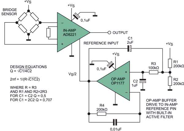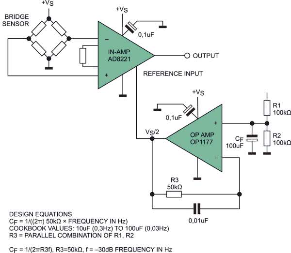 Ponadto w systemie używa się prostego dzielnika rezystancyjnego na szynie zasilającej i bufora w postaci wzmacniacza operacyjnego do dostarczania napięcia odniesienia do wzmacniacza, wszelkie zmiany napięcia zasilania są przepuszczane przez ten obwód z niewielkim tłumieniem i dodawane bezpośrednio do poziomu napięcia wyjściowego wzmacniacza pomiarowego. Tak więc, jeśli nie zostanie tutaj dodany odpowiedni filtr dolnoprzepustowy, to wysoki PSRR scalonego wzmacniacza pomiarowego zostanie istotnie pogorszony.