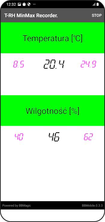 Dzięki temu wartości maksymalne i minimalne rejestrowane są ciągle, a po połączeniu z rejestratorem na ekranie smartfona dostępne są najświeższe wykonane pomiary. Implementacja funkcji pomiarowych get_t() i get_rh() zależy oczywiście od zastosowanego układu pomiarowego. W naszym przypadku ich implementowanie byłoby bezcelowe, ponieważ łatwe przeniesienie kodu na platformę docelową nie jest możliwe. Poza tym w tej części projektu kładziemy nacisk na przygotowanie interfejsu mobilnego i jego obsługi.