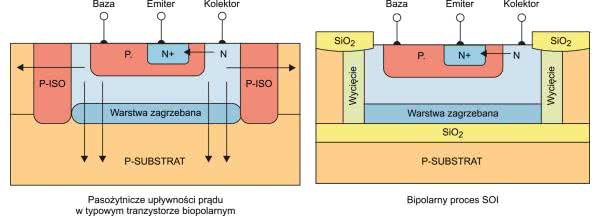 Izolacja z pomocą wycięcia, krzem na izolatorze (SOI) i inne odmiany standardowego procesu produkcyjnego dla urządzenia krzemowego znacznie zmniejszają prąd upływu i umożliwiają pracę z doskonałymi parametrami przy temperaturach wynoszących znacznie powyżej 200°C. Rysunek 3 ilustruje, w jaki sposób dwubiegunowy proces SOI zmniejsza obszar upływu prądu. Materiały szerokopasmowe, takie jak węglik krzemu (SiC), podnoszą poprzeczkę jeszcze wyżej; W badaniach laboratoryjnych układy scalone z węglika krzemu działały poprawnie w temperaturach do 600°C. SiC to jednak nowa technologia procesowa i obecnie na rynku dostępne są tylko proste urządzenia wykonane z tego materiału, takie jak tranzystory mocy, moduły IGBT, diody prostownicze itp.
