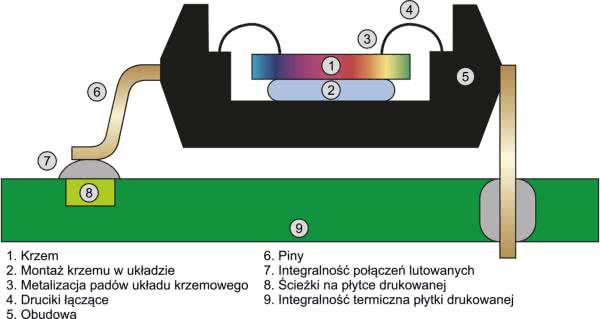 Gdy zaprojektowano już funkcjonalny układ krzemowy, odporny na wysokie temperatury, bitwa jest wygrana tylko w połowie. Obudowa urządzenia półprzewodnikowego, a następnie przymocowanie jej do PCB nie jest trywialne, jeśli projektuje się urządzenie przeznaczone do pracy w wysokiej temperaturze. Wiele czynników wpływa na zachowanie obudowy układu scalonego w wysokiej temperaturze, jak pokazano na rysunku 4.