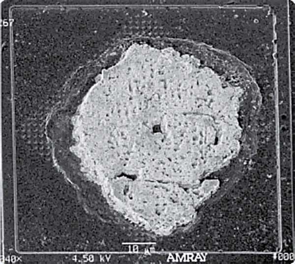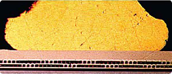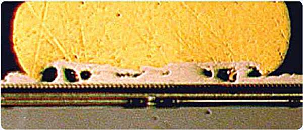 Rysunek 6 pokazuje znaczny wzrost faz międzymetaliczny w strukturze Au/Al i puste przestrzenie Kirkendalla po rozerwaniu wiązania w wysokiej temperaturze. Co gorsza, halogeny, takie jak brom i chlor – czasami występujące w mieszankach do zatapiania – mogą powodować powstawanie korozji na granicy faz metalicznych w podwyższonej temperaturze, skracając czas układu i prowadząc do jego przedwczesnej awarii (chociaż na szczęście przemysł przechodzi obecnie na „zielone”, bezhalogenowe związki). W związku z tym istnieje silna potrzeba stosowania takich samych metali do wykonywania metalizacji padów i drutu do zgrzewania, aby uniknąć opisanych tutaj, negatywnych zjawisk. Jeśli nie jest to możliwe, inżynierowie projektujący układ scalony powinni wybrać metale, które charakteryzują się wystarczająco wolnym wzrostem IMC i szybkością dyfuzji, tak, aby układy scalone były niezawodne w wymaganym okresie życia. Rysunek 7 ilustruje wytrzymałość wiązania monometalicznego w podwyższonej temperaturze. Odcinek wiążący nie wykazuje oznak wzrostu IMC po 3000 godzinach w 195°C.