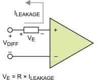 Projektant obwodów, pracujących w wysokich temperaturach, musi uwzględnić zmiany parametrów układów scalonych i elementów pasywnych w szerokim zakresie temperatur, zwracając szczególną uwagę na ich zachowanie w skrajnych temperaturach, aby zapewnić pracę obwodu w docelowych granicach temperatur. Przykłady obejmują dryf napięcia offsetu, płynące z temperaturą błędy wzmocnienia, różne współczynniki temperaturowe, wartości napięcia, rozpraszanie mocy, upływ do laminatu i upływ wewnętrzny innych elementów dyskretnych – takich jak te stosowane w urządzeniach zabezpieczających przed wyładowaniami elektrostatycznymi i przepięciami. Na przykład w sytuacjach, gdy wysoka impedancja źródła jest połączona szeregowo z pinem wejściowym wzmacniacza, niepożądane prądy upływu (inne niż własny prąd polaryzacji wzmacniacza) mogą powodować offsety, które przełożą się na błąd pomiaru prądu polaryzacji (rysunek 10).