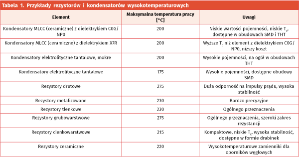 Obecnie dostępnych jest na rynku kilka elementów pasywnych do pracy w wysokich temperaturach. Rezystory i kondensatory są wszechobecne w każdym projekcie obwodu. Niektóre dostępne na rynku opcje zestawiono w tabeli 1.
