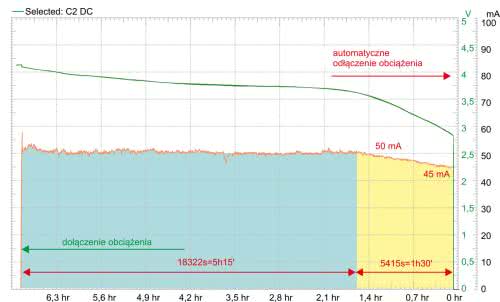 Z wykresu pokazanego na rysunku 3 możemy łatwo obliczyć pojemność akumulatora. Jest to po prostu pole pod krzywą rozładowania. Oczywiście do obliczeń przyjmiemy pewne uproszczenia. Zakładamy, że proces ładowania składa się z dwóch faz. W pierwszej akumulator jest rozładowywany prądem stałym, który w naszym eksperymencie był równy 50 mA. Faza ta trwała 18922 sekundy (5 godz. 15 min.), co odpowiada pojemności 18922·50/3600=263 mAh. W drugiej fazie trwającej 5415 sekund (1 godz. 30 min) prąd zmniejszał się liniowo z 50 mA do 45 mA. Możemy więc przyjąć, że do obliczenia pojemności akumulatora w tej fazie należy policzyć pole trapezu: (50+45)·5415/2/3600=71 mAh. Całkowita pojemność akumulatora jest równa sumie tych dwóch wartości, czyli 334 mAh. Pamiętajmy jednak, że ze względu na liczne założenia parametr ten należy traktować tylko orientacyjnie. Notabene okazało się, że uzyskaliśmy pojemność nieznacznie większą od znamionowej (320 mAh).