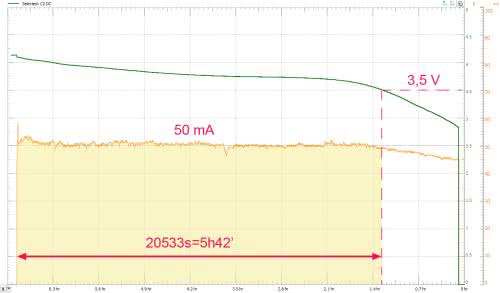 Na rysunku 3 został pokazany wykres rozładowania testowanego akumulatora 320 mAh. Napięcie nieobciążonego akumulatora po naładowaniu jest równe ok. 4,134 V. Po dołączeniu obciążenia spada ono do ok. 4,093 V. Krzywa rozładowania opada początkowo dość wolno aż do momentu, w którym napięcie akumulatora osiągnie wartość ok. 3,7 V. Teraz następuje faza, w której zmiany napięcia są prawie niezauważalne. Po ok. 17000 sekundach (4 godziny 40 minut) obserwujemy dość szybkie dalsze zmniejszanie się napięcia akumulatora. W chwili przekroczenia 2,825 V elektronika zabezpieczająca ogniwa odłącza je od zacisków akumulatora. Od tego momentu rejestrujemy zerowe napięcie i zerowy prąd akumulatora. Zasadniczo przyjmuje się, że dla akumulatora litowo-polimerowego krytyczne jest napięcie 2,5 V. Jak widać, w testowanym egzemplarzu próg był ustawiony nieco wyżej.