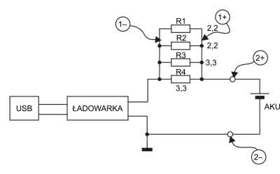 Algorytm ładowania akumulatorów litowo-jonowych czy litowo-polimerowych jest określony dość precyzyjnie. Sprawdźmy, jak jest realizowany w prostej ładowarce. W tym celu należy opracować prosty układ mierzący prąd ładowania i pozwalający monitorować napięcie na akumulatorze. Powinien on jednak w jak najmniejszym stopniu ingerować w proces ładowania, co oznacza, że zastosowany do pomiaru natężenia prądu rezystor powinien mieć jak najmniejszą rezystancję. Każda wtrącona do obwodu ładowania rezystancja może „mylić” ładowarkę. Ostatecznie rezystor pomiarowy składa się z połączonych ze sobą równolegle dwóch rezystorów 2,2 Ω i dwóch rezystorów 3,3 Ω (rysunek 5). Teoretycznie rezystancja zastępcza powinna być równa 0,66 Ω, ale zmierzona omomierzem była równa 0,7 Ω.