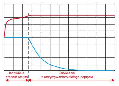 Jak widać, ładowarka niezbyt dokładnie realizuje zalecany algorytm, który zakłada ładowanie prądem stałym w pierwszej fazie, a w drugiej utrzymywanie stałego napięcia (rysunek 7). W drugiej fazie prąd maleje wykładniczo. Wprawdzie podczas ładowania testowanego akumulatora widoczne jest jakieś wahnięcie prądu w początkowej fazie ładowania, ale trudno jest stwierdzić, jaka jest tego przyczyna, a zmierzona charakterystyka raczej nie przypomina zalecanej.