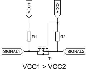 Bardzo popularnym rodzajem konwertera jest układ z tranzystorem MOSFET z kanałem N oraz dwoma rezystorami. Schemat tego rozwiązania został pokazany na rysunku 1. Jego cena z pewnością jest akceptowalna, lecz ma ono pewną wadę: czasy narastania i opadania napięcia nie są jednakowe. Dzieje się tak, ponieważ stan wysoki jest wymuszany przez rezystory, a niski przez układ nadajnika i sam tranzystor. Przy wyższych szybkościach transmisji danych to zjawisko daje znać o sobie, prowadząc do zniekształcenia czasu trwania impulsów. Poza tym kilka takich konwerterów może zająć sporo miejsca na powierzchni płytki drukowanej, zwłaszcza wtedy, kiedy elementy bierne muszą być w obudowach SMD1206.