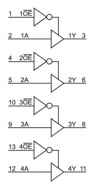 Czy istnieje rozwiązanie, które łączy zalety specjalizowanych konwerterów i prostego układu z rysunku 1? Okazuje się, że tak. Wystarczy przychylnym okiem spojrzeć na zwykłe układy logiczne z serii AHCT, a dokładniej mam na myśli 74AHCT125. Zawiera cztery niezależne bufory z wejściami aktywującymi. Dokładną konfigurację pokazuje rysunek 2. Ze względu na specyfikę tej rodziny może być zasilany napięciem od 4,5 V do 5,5 V.