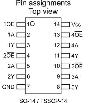 Jedynie układ wyprowadzeń nie jest zbyt wygodny (rysunek 4), ponieważ wejścia i wyjścia buforów nie zostały ułożone naprzeciw siebie. Za to cena układu jest do zaakceptowania – poniżej 30 gr netto za sztukę w hurcie (wrzesień 2021) za układ 74AHCT125S14-13.