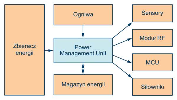 Aby system był poprawnie zasilany, konieczne jest ustabilizowanie prawidłowego napięcia dla elektroniki. Na rysunku 1 został pokazany moduł zarządzania zasilaniem, który realizuje wiele różnych zadań. Pierwszym jego zadaniem jest dopasowanie impedancji wejściowej w celu uzyskania maksymalnej ilości zebranej energii. Kolejne zadania to ładowanie pośredniego magazynu energii, kierowanie mocy z konwencjonalnej baterii pierwotnej (jeśli takowa występuje w systemie) i finalnie stabilizowanie docelowego napięcia wyjściowego dla systemu oraz monitorowanie przepływów prądu i napięć w celu zwiększenia niezawodności całego systemu.