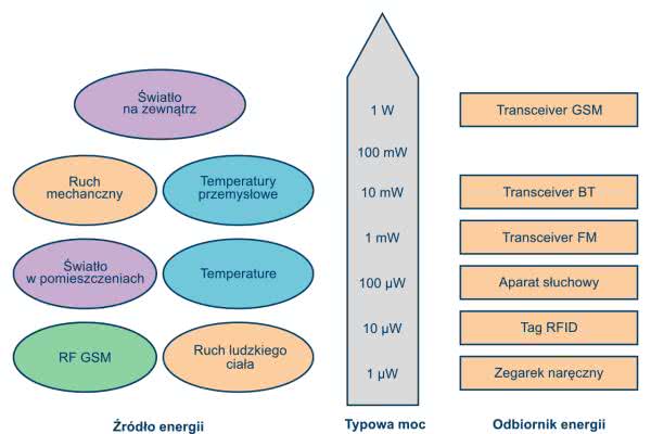 Na rysunku 2 pokazano różne rodzaje źródeł energii i związane z nimi ilości energii, którą można z grubsza wytworzyć przy użyciu systemu o wielkości 10 cm2. Po lewej stronie pokazano źródła energii, a po prawej zużycie energii przez różne rodzaje urządzeń. Skala (na środku) jest skalą logarytmiczną, co podkreśla ogromne różnice pomiędzy poszczególnymi rodzajami źródeł energii. Ten schemat jest bardzo ważny, ponieważ pozwala uzyskać realistyczne wyobrażenie o wykonalności danego pomysłu. Często projektanci wkładają sporą pracę i wysiłek w ocenę rozwiązania do pozyskiwania energii tylko po to, aby dowiedzieć się, że zebrana przez nie energia nijak nie wystarczy do zasilania projektowanego systemu.