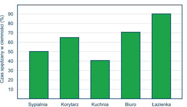 Innym aspektem, który pomaga w takich sytuacjach, jest niski prąd spoczynkowy układu ADP5090. Podczas stanu alarmowego, pobór prądu wynosi tylko 260 nA. Na rysunku 4 pokazano typową aplikację takiego systemu w rzeczywistym układzie. Wykres zawiera różne miejsca w budynku mieszkalnym i typowe czasy, jakie czujnik z ogniwem słonecznym spędza w ciemności w danej lokalizacji. Oczywiście, są to tylko typowe, średnie wartości. Realnie, ilość światła, jaką zobaczy konkretny moduł, zależy ściśle od rozkładu domu, liczby okien, ilości używanego światła elektrycznego i dokładnej lokalizacji czujników. Również pora roku i lokalizacja domu będą miały wpływ na przedstawione zależności. W tak zmiennych warunkach oświetleniowych niski pobór mocy układu ADP5090 ogromnie pomaga w oszczędzaniu energii, szczególnie w systemach, które spędzają większość czasu w ciemności.