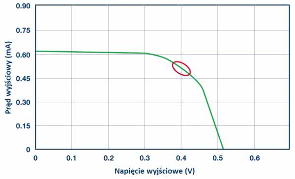 Aby działać w pobliżu maksymalnego punktu mocy szczytowej, układ musi cały czas śledzić ten punkt. Samo ustawienie stałej wartości prądu, którą jest pobierany z ogniwa, nie zadziała, ponieważ krzywa danego ogniwa słonecznego (rysunek 5) będzie się przesuwać w zależności od różnych warunków oświetlenia. Aby śledzić MPP (maksymalny punkt mocy szczytowej), układ ADP5090 przestaje przewodzić prąd na wejściu, sprawdza napięcie ogniwa słonecznego bez obciążenia, a następnie ustawia MPP na następne 16 sekund.