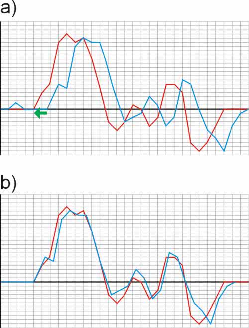 W jednej z konfiguracji pomiarowych system składa się z kilku takich rejestratorów. Są one dodatkowo wyposażone w niezależny tor radiowy służący do zdalnego, jednoczesnego uruchamiania pomiaru przez wszystkie urządzenia pracujące na jednym obiekcie. Jest to możliwe dzięki temu, że w zestawie składającym się z kilku urządzeń tylko jedno ma status Master, reszta zaś to urządzenia podporządkowane – Slave. Operator startuje Mastera, który zanim rozpocznie rejestrację wysyła radiem synchronizacyjnym sygnał startu do pozostałych urządzeń. Jest to jeden komunikat odbierany jednocześnie przez wszystkie Slave’y. Dokładność synchronizacji jest w zupełności zadowalająca, wielokrotnie lepsza niż okres pobierania próbek. Taktowanie pobieraniem próbek jest realizowane przez indywidualny zegar w każdym rejestratorze. Jest on napędzany tym samym kwarcem, który taktuje transmisją danych. Można więc uznać, że rejestratory startują na tym samym tiku wewnętrznego zegara, przy czym tiki te mogą być przesunięte względem siebie maksymalnie o okres próbkowania. Ponieważ takie przypadki zwykle występują, więc oprogramowanie komputerowe obrabiające dane ma specjalną procedurę, która dosuwa wszystkie kanały do jednego, wspólnego punktu startowego (rysunek 1) i dalej zachowuje już oryginalne odległości między danymi.