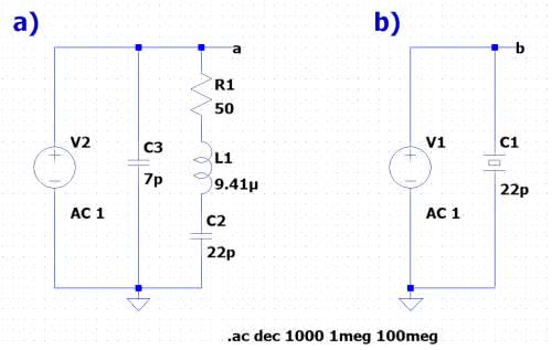 Zestaw Analog Discovery 2 zawiera m.in. narzędzie Impedance. Jak można się domyślić, służy ono do zdejmowania charakterystyk częstotliwościowych elementów biernych R, L, C lub obwodów z nich złożonych. Takim obwodem może być na przykład rezonator kwarcowy. Jego schemat zastępczy przygotowany w symulatorze LTspice pokazano na rysunku 3a. Na schemacie z rysunku 3b użyto do symulacji elementu bibliotecznego reprezentującego rezonator kwarcowy.